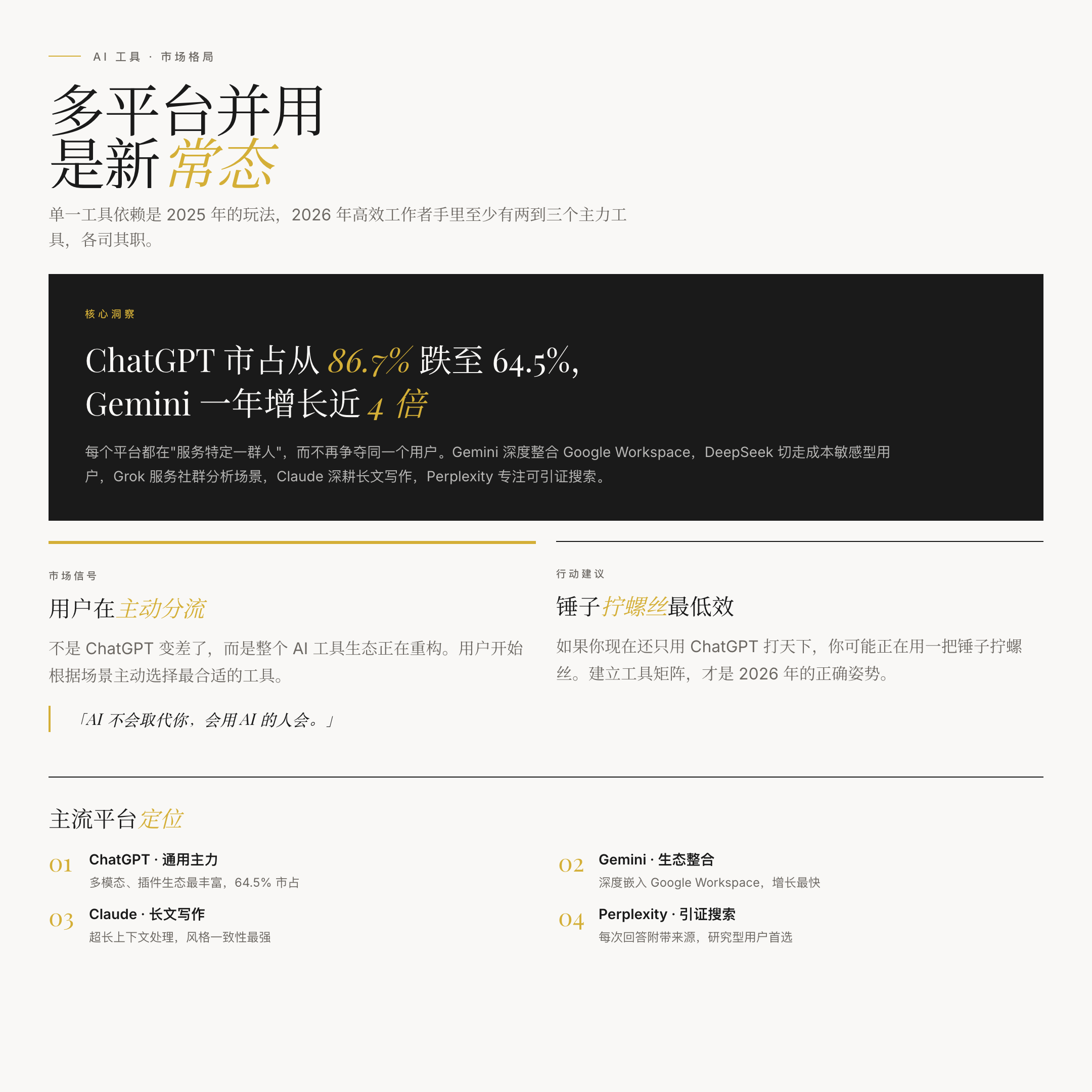 每个平台都在”服务特定一群人”,而不再争夺同一个用户。这意味着什么?单一工具依赖是 2025 年的玩法,2026 年的高效工作者,手里至少有两到三个主力工具,各司其职。