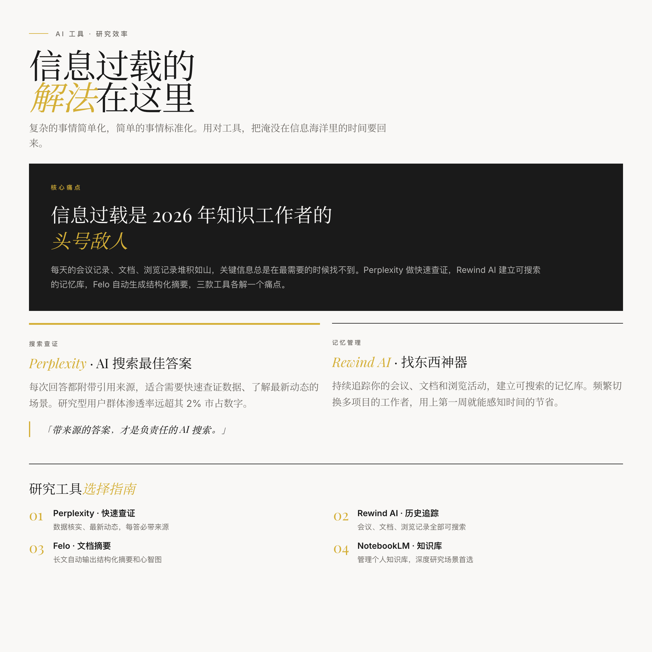 真正有效率的工作者,不是装了最多 AI 工具的人,而是清楚地知道”什么场景用什么工具、为什么用它”的人。