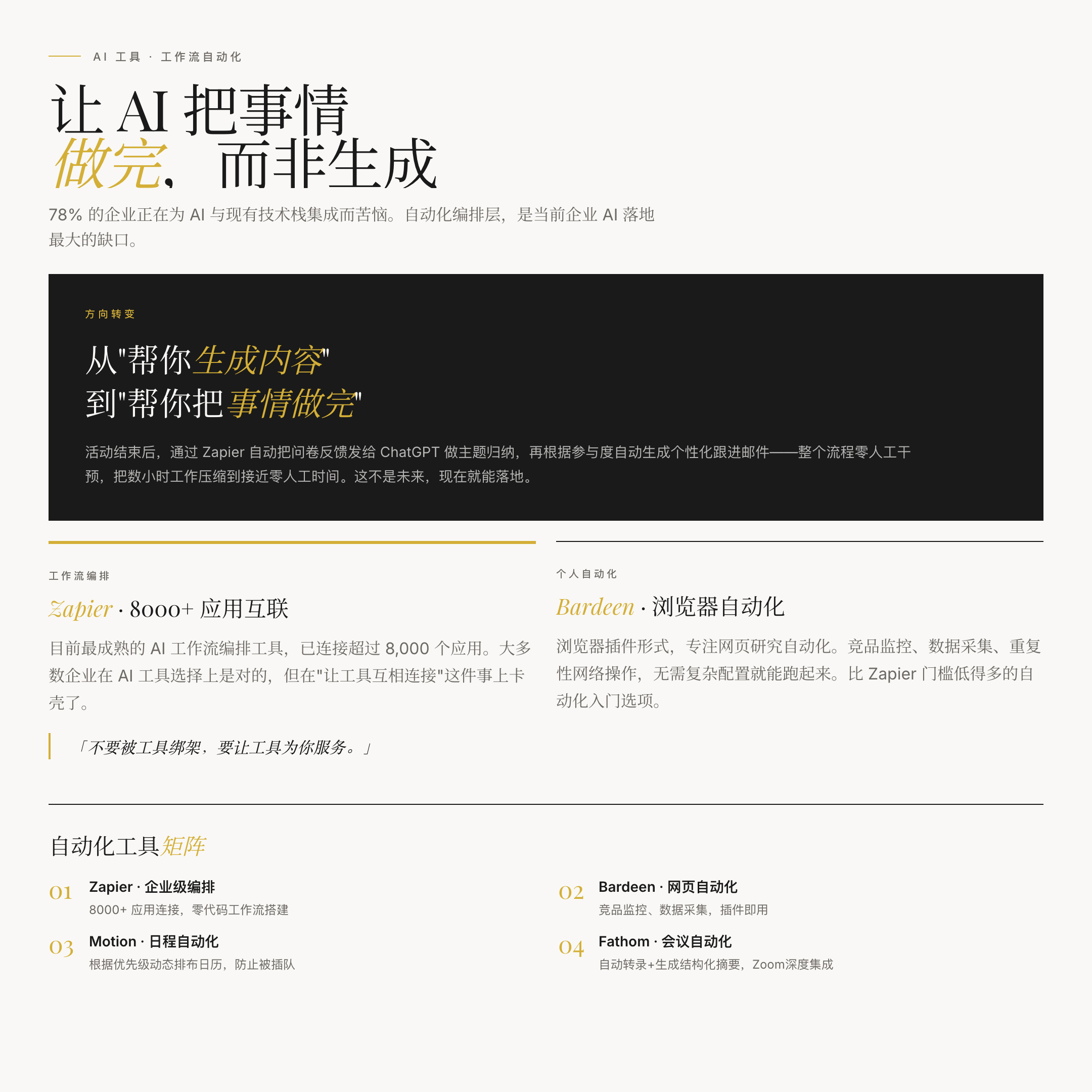 Zapier:目前最成熟的 AI 工作流编排工具,已连接超过 8,000 个应用。用一个具体的例子来说明它的价值:活动结束后,通过 Zapier 可以自动把问卷反馈发给 ChatGPT 做主题归纳,再根据参与者的参与度自动生成个性化跟进邮件——整个流程零人工干预,把数小时工作压缩到接近零人工时间。这不是未来,现在就能落地。