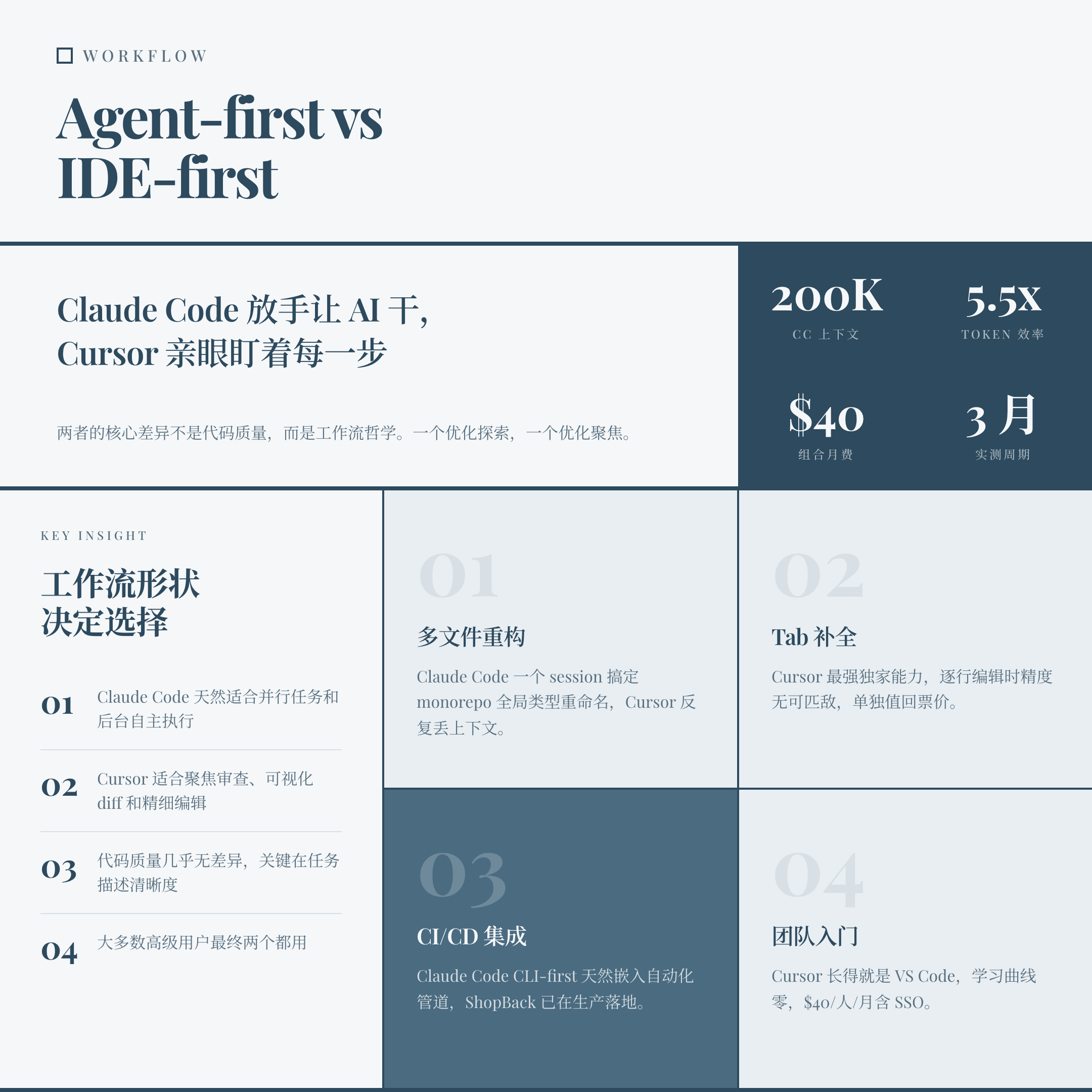 • 需要自动化 PR 审查?两个都用 — Claude Code 通过 GitHub Actions 抓架构问题,Cursor 的 BugBot 抓 bug 和安全隐患。