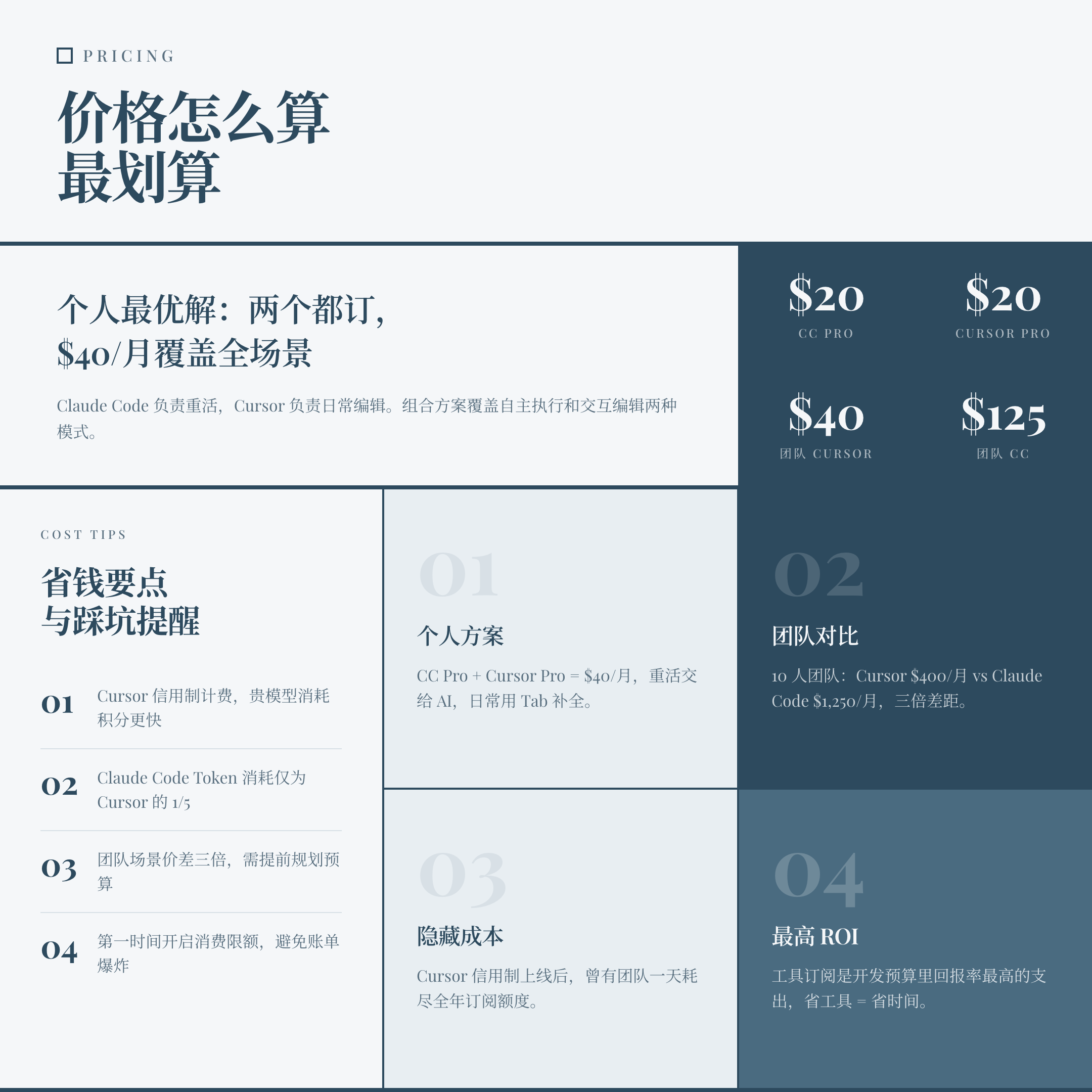个人开发者最优解:两个都订。 Claude Code Pro + Cursor Pro 合计 $40/月。Claude Code 处理重活(重构、测试生成、CI/CD),Cursor 处理日常编辑和代码审查。这个组合覆盖了几乎所有场景。