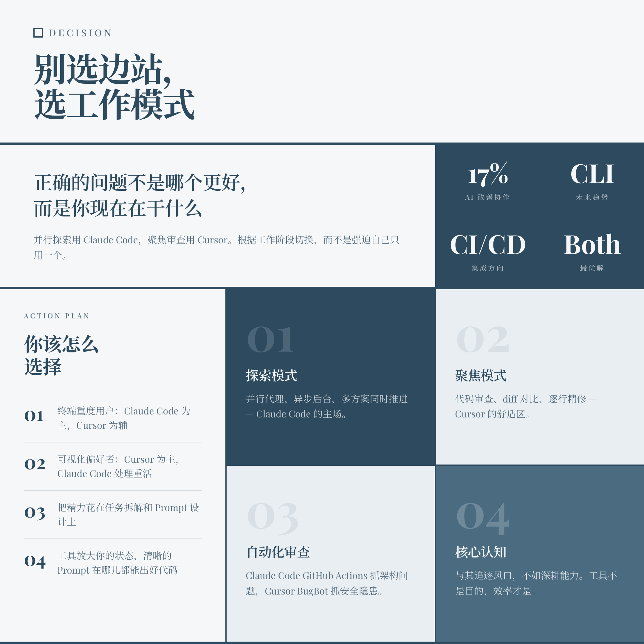 • 需要安静聚焦、审查 diff、逐行精修、理解代码上下文?用 Cursor。
