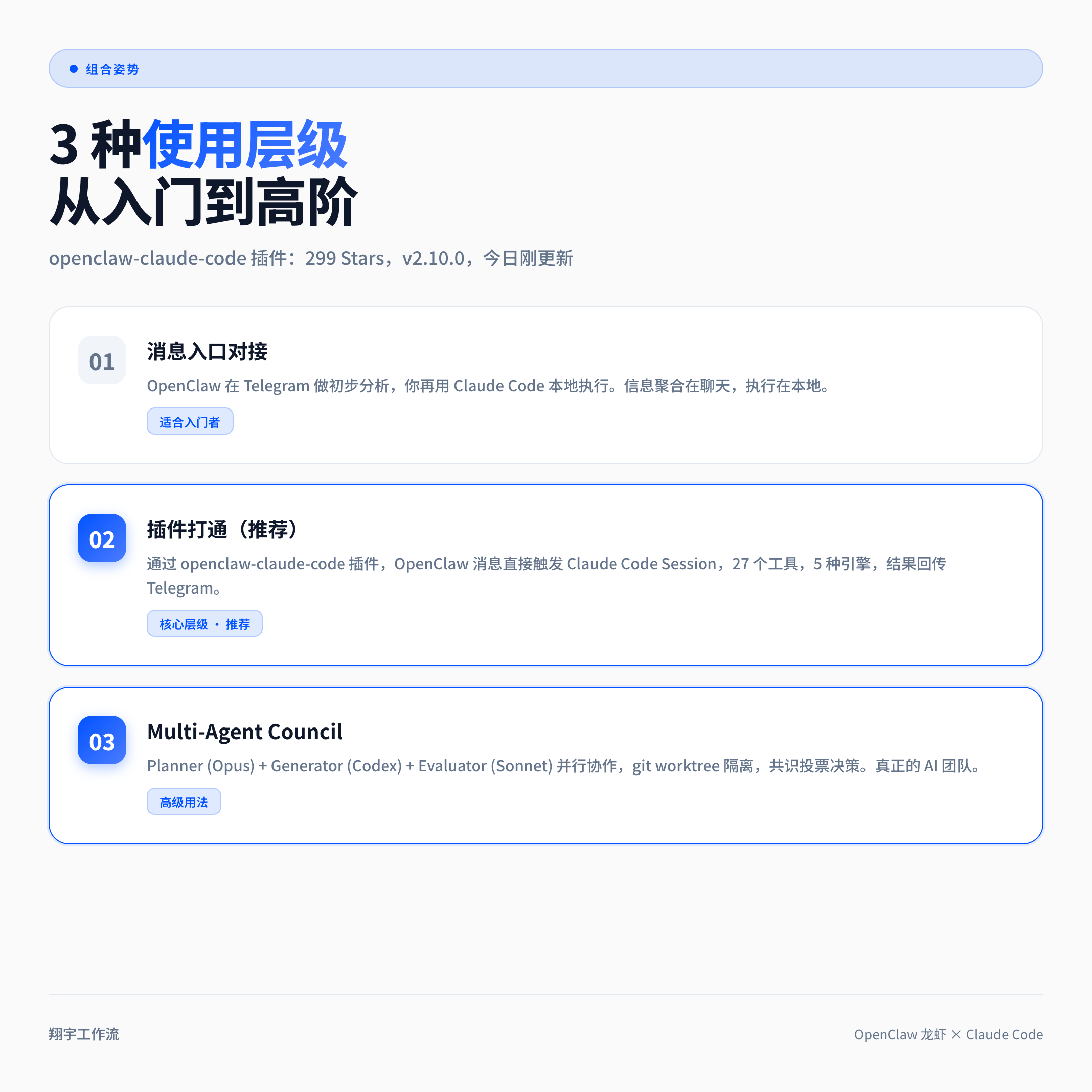 这是关键层级。GitHub 上有一个叫 enderfga/openclaw-claude-code 的开源插件(299 Stars,持续活跃更新),专门解决「Agent 程序化驱动 Claude Code」的问题。