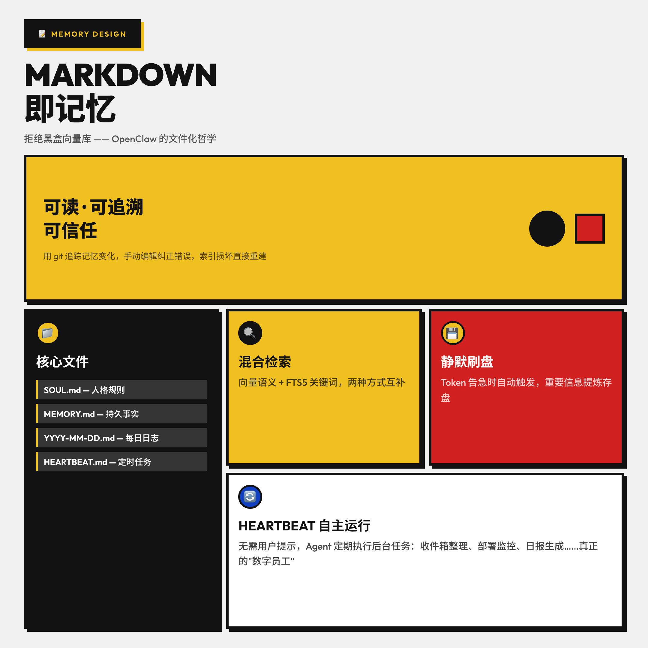 这套设计让 Agent 的状态完全透明——你可以打开 MEMORY.md 直接看它记住了什么,用 git 追踪记忆的变化,甚至手动编辑纠正它的错误认知。