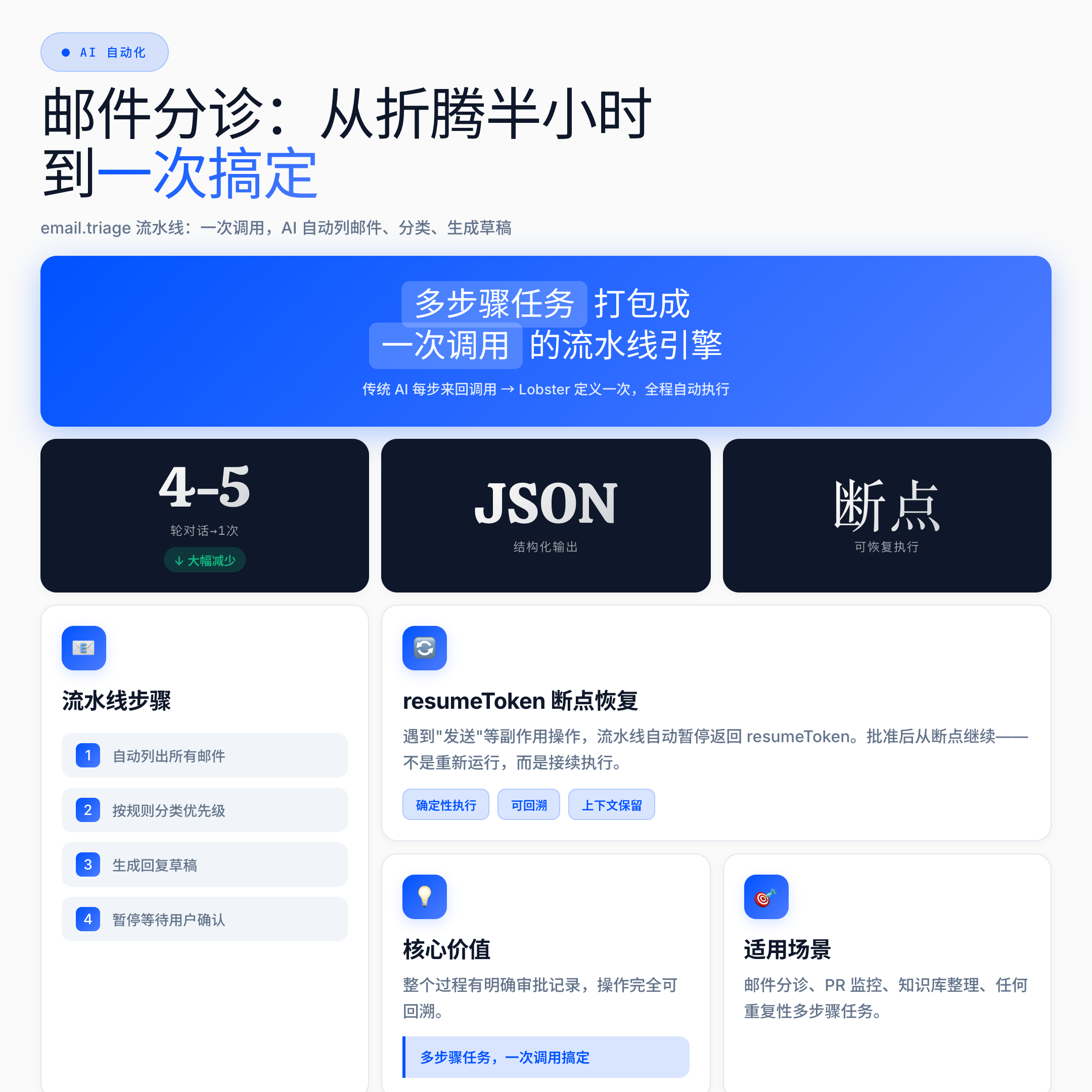 用 Lobster 定义 email.triage 流水线之后,整个流程是这样的:一次调用,AI 自动列出邮件、按规则分类、生成草稿;遇到”发送”这类副作用操作,流水线会自动暂停,返回一个结构化 JSON——5 need replies, 2 need action——同时返回 resumeToken。我看完确认没问题,批准,流水线从暂停点继续执行——不是重新运行所有步骤,而是从断点恢复。