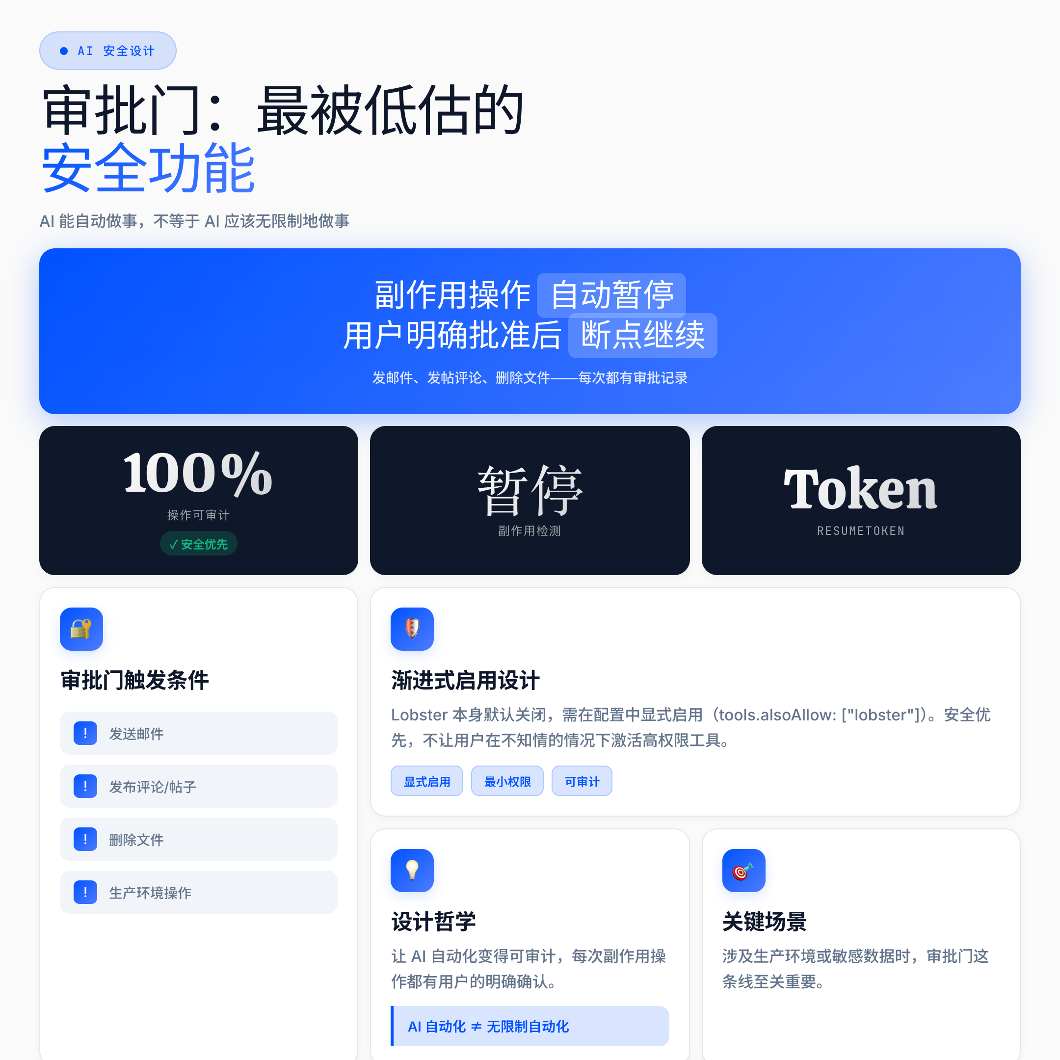我想专门说说审批门(approval gates),很多介绍都一笔带过,但我用下来觉得这是 Lobster 设计里最聪明的部分。