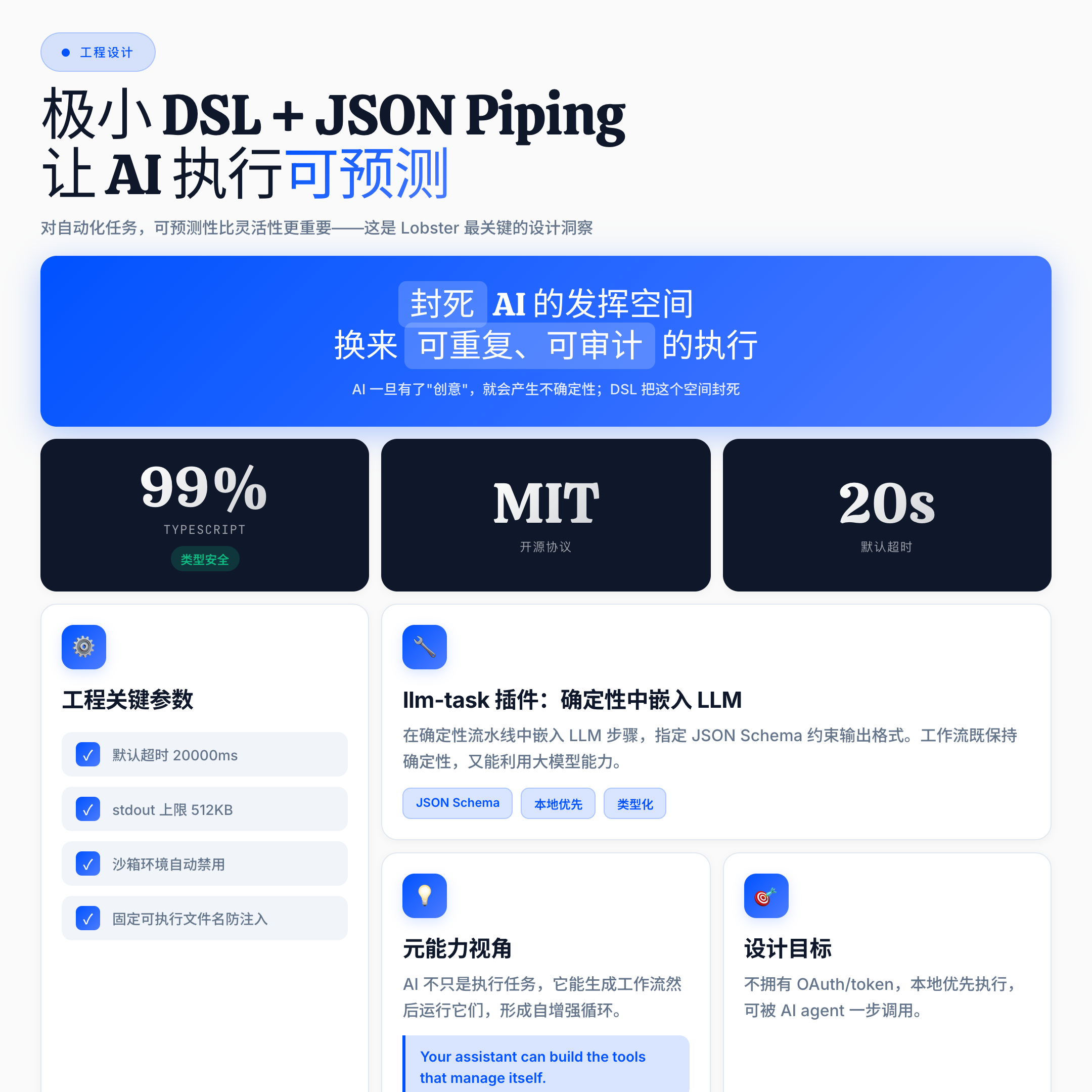 很多人问:为什么不直接用普通脚本?官方文档给出了四个理由,我觉得第三条最关键:极小语法 + JSON piping 减少 AI 的”创意”代码路径。这句话背后藏着一个重要洞察——对于自动化任务,可预测性比灵活性更重要。AI 一旦有了”发挥空间”,就会产生不确定性;Lobster 用 DSL 把这个空间封死,换来的是可重复、可审计、可恢复的执行过程。