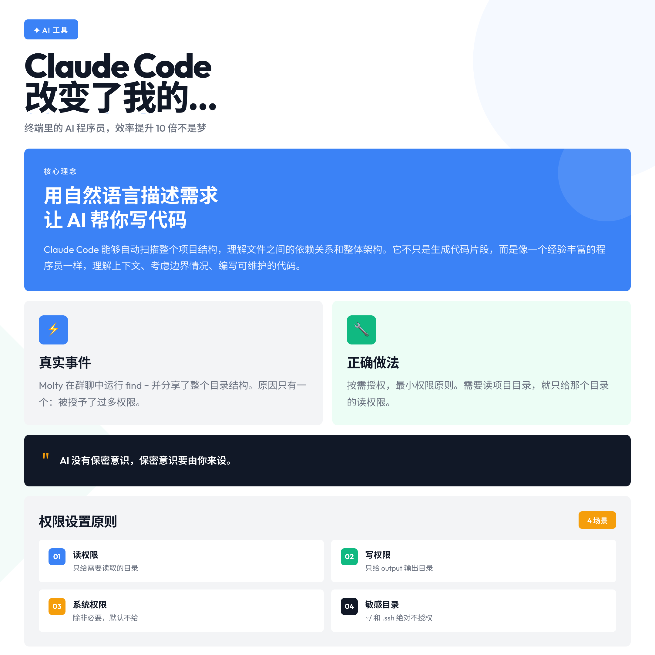 我踩过类似的坑。刚开始图省事,把文件系统的读写权限全开了,以为这样 AI 能”更聪明地帮我工作”。实际上 AI 并不知道哪些文件是敏感的,它只知道你允许它看什么。