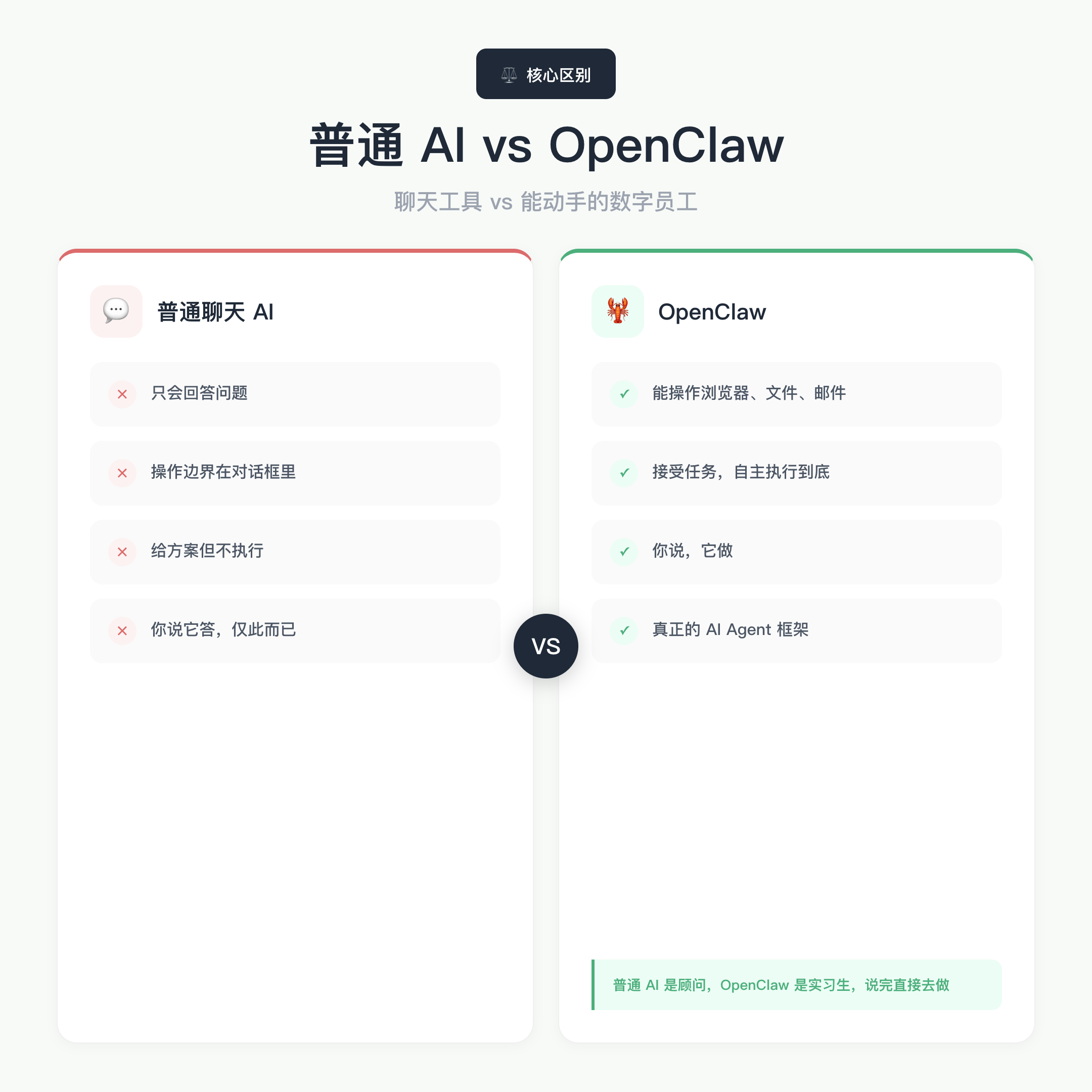 用一个类比来理解:普通聊天 AI 是顾问,给你出主意但不帮你执行;OpenClaw 是实习生,你说「帮我把竞品官网每天更新的内容整理成表格发给我」,它真的会每天去做,不用你再操心。