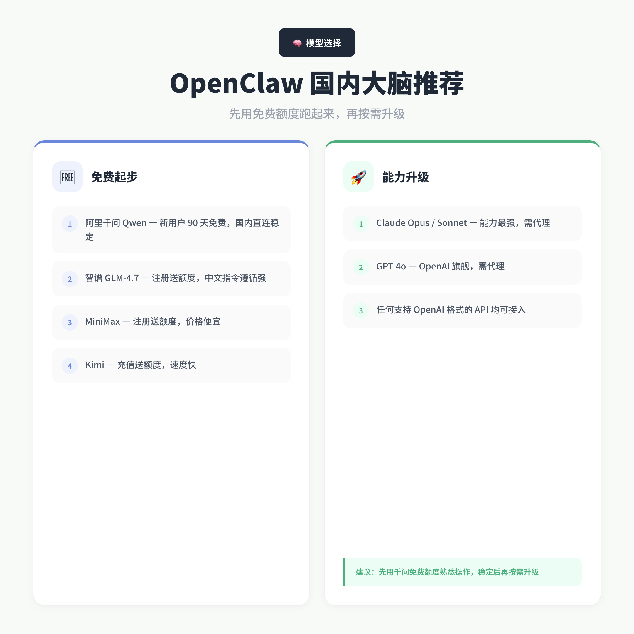 OpenClaw 是个框架,本身没有推理能力,需要你接一个大模型 API 当大脑。选对模型,用起来顺;选错了,体验很差。